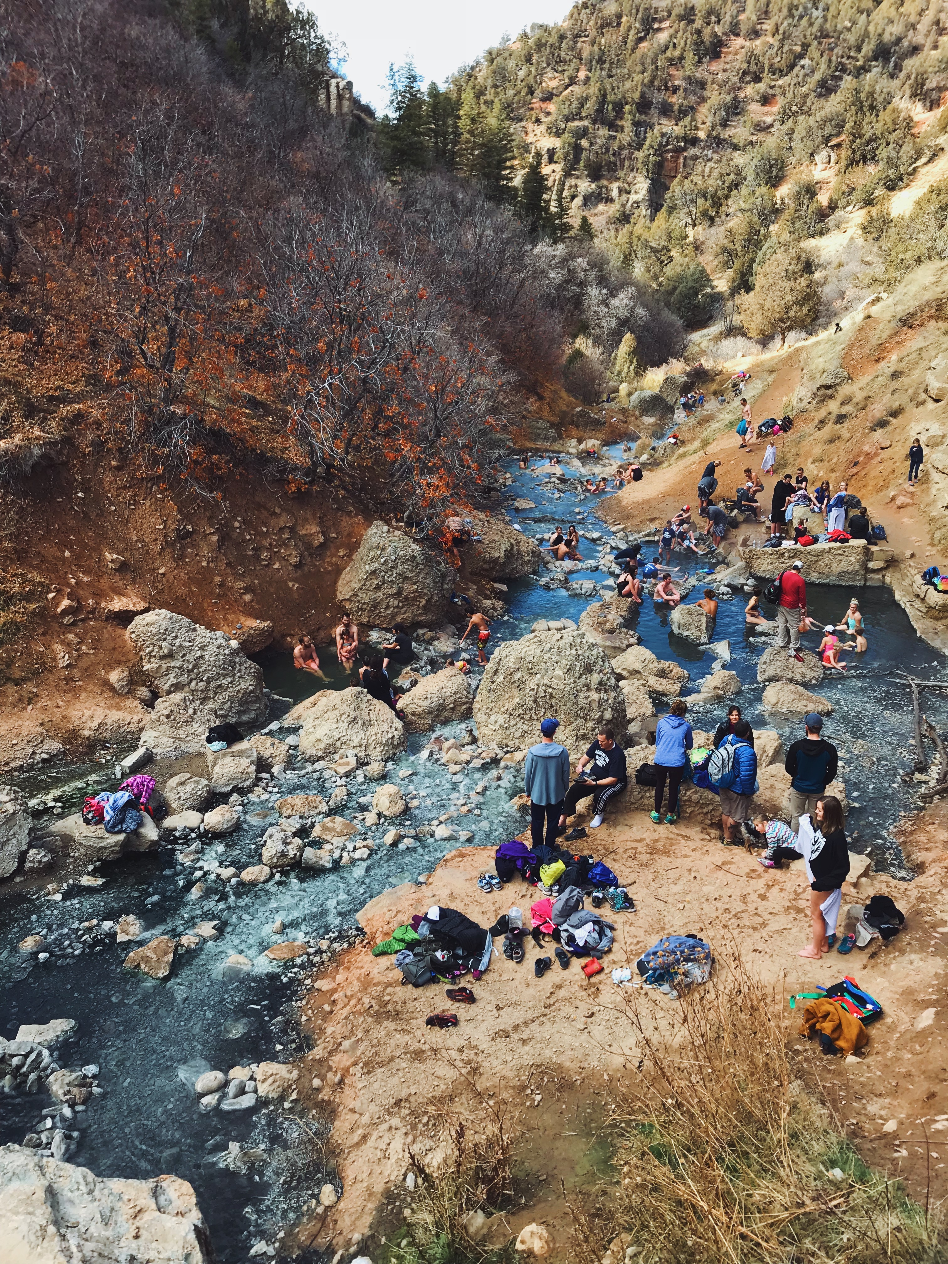 Word has it that the springs gets real busy during the weekends, especially in the spring and summer months. We had traveled there on a Saturday morning in late November and there was still a crowd of people. I can only imagine how busy it gets during the summer months. To avoid crowds, I’d recommend going early morning or late in the day. It’s gets especially quiet during the summer months. When we had arrived at noon most of the pools upstream were occupied, but luckily we found a vacant pool at the bottom of the stream. Most of these pools are about 3 foot deep. Perfect for soaking, not for swimming.