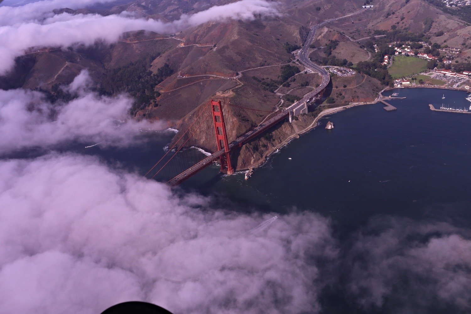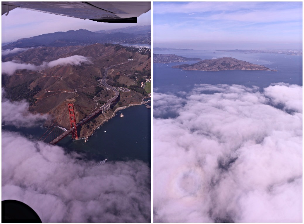 Our flight started out over Oakland and Alameda, and we slowly headed over to the Golden Gate bridge. On the way to the GG bridge, we flew over Coit Tower, Transamerica building, and Alcatraz. When we finally made it to the Golden Gate bridge, I was in complete awe. The signature image of the Karl the Fog creeping over the GG bridge was happening right before my eyes. We then flew over the Marin Headlands, looped around Tiburon and headed back to the Oakland Airport.